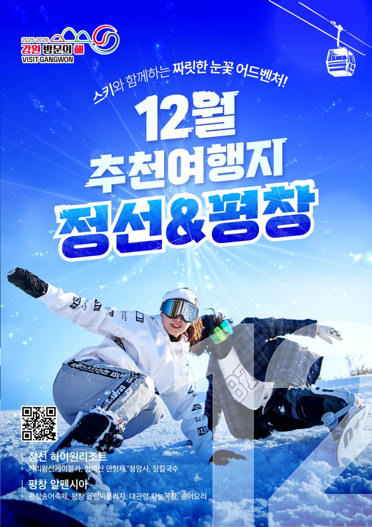 강원특별자치도와 강원관광재단은 ‘2025-2026 강원 방문의 해’ 12월 추천 여행지로 정선군과 평창군을 선정하여 대대적인 홍보마케팅을 추진한다고 밝혔다. 12월에는 스키 개장 시즌에 맞춰 정선의 ‘하이원리조트’와 평창의 ‘알펜시아’를 집중적으로 홍보할 예정이다.